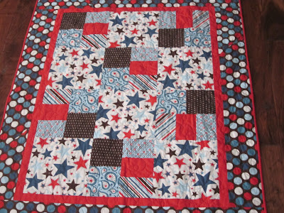 I love stars and I love polka dots...I'm also a little partial to anything cute that could look good in a little boys room, so of course I loved this fabric line. I think this quilt turned out pretty dang cute also. Its a great size for a crib, toddler, or small throw. Perfect to throw over the crib or at the end of a bed.